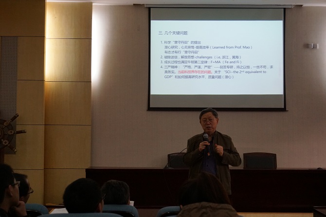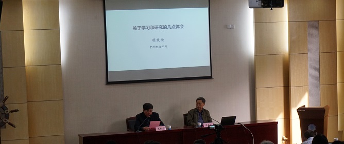 胡敦欣院士结合个人从事海洋科学研究55年的经历和体会,向在座师生们讲述了自己的学习方法、学术理念和研究成果。结合他本人在我国陆架和西太平洋环流的主要标志性成果研究历程,胡院士提出做科学研究一定要潜心钻研、心无旁骛,更要破除迷信、解放思想,敢于挑战权威;胡院士认真阐述了成长过程应满足牛顿第二定律F=MA,个人成长需要内力和外力的驱动;强调做学问一定要有“三严”精神,即严格、严谨、严密,要做到求真务实,一丝不苟,持之以恒。他提出当前科技界存在的问题,如只重视SCI的数量等;建议大家一定要立足实际,务实重行,努力提高研究水平和质量。