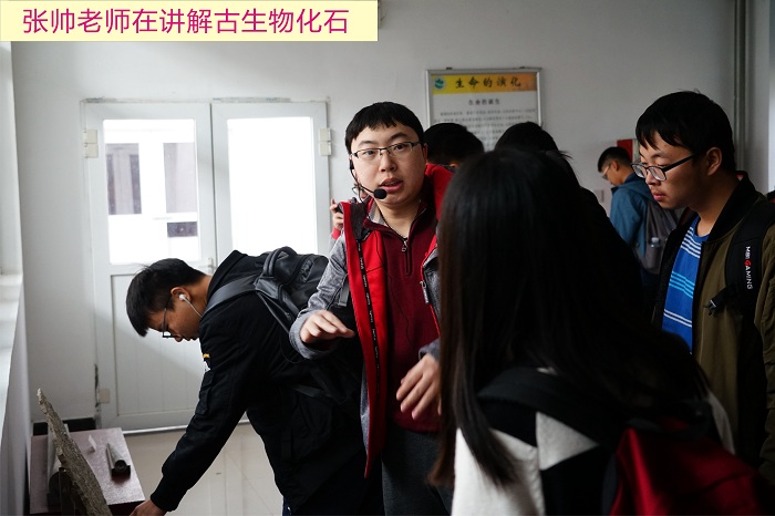 上午九时许,全体师生乘坐的大巴到达了本次实习的第一站——桂子山石柱林。所谓石柱林,由六边形规则的石柱群体组成。其石柱,每根直径约40-60厘米,高20-30米,紧密排列,垂直于岩层层面,构成半壁石林,恢宏壮观。带队老师叶现韬、丁腾、刘建强和颉炜四位老师详细讲解了1)该地石柱林由于火山喷发,玄武岩浆溢出地表,随之均匀冷却和缓慢收缩裂开而形成柱体的作用机理,还作图给同学们解释了石柱六边形面的形成过程;2)地幔包体的矿物组成、来源以及其珍贵性。同学们在赞叹大自然的鬼斧神工之余,也在老师的引导下积极利用所学知识对这种神奇地质现象进行解释,做到了将现实与书本知识的结合。随后,同学们在老师的带领下参观了山脚下的地质陈列馆,在张帅老师的讲解下,学习了丰富多样的古生物化石、矿物等地质标本。