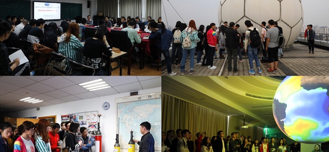 图1 同学们聆听SOED国重室报告及参观卫星地面接收站、Argo数据中心、小球大世界海洋科普展台