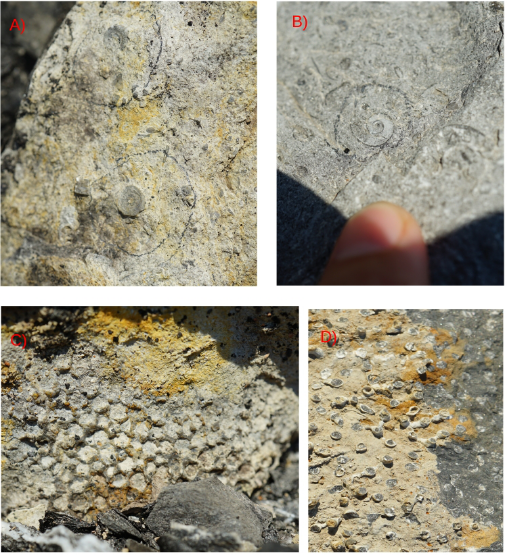 图2、采集的化石标本。A)栖霞组灰岩中海百合茎横切面;B)栖霞组灰岩中螺类化石;C、D)金陵组灰岩中珊瑚骨架化石。