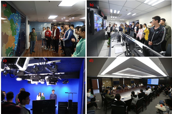 a)听取浙江省海洋观测网的讲解;b)和c)参观海况预报演播室;d)听取预报中心构成及业务介绍