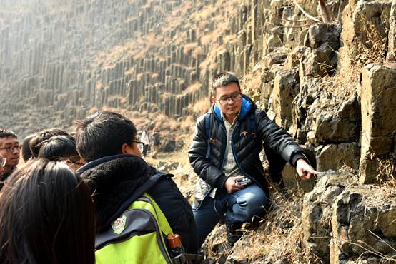12月16日上午,抵达六合国家地质公园后,讲解老师带队参观由玄武岩构成的石柱林。通过老师的讲解,同学们了解了基性火成岩玄武岩与超基性岩地幔包体橄榄岩的产生原因,岩浆岩的地质分类和种类,学习了与内外动力地质作用有关的知识点,玄武岩“柱状节理”,“杏仁状气孔”的形成过程。除了聆听老师的讲解,同学们还仔细观察了玄武岩的颜色,气孔,节理面等物理特征,在玄武岩节理面上找寻淡绿色的橄榄岩包体,对玄武岩和地幔包体有了更直观的认知。参观完石柱林,同学们跟随带队老师登山远眺远处两座死火山的火山锥形貌,感受大自然强大的创造力。