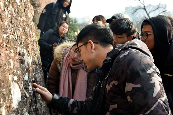 同天下午,大家来到“钟灵毓秀”石头城遗址公园,在各位带队老师的带领下,四组同学重新焕发了精神,一下车就聚精会神地开始倾听老师的专业讲解并积极地开始找寻所提到的地质现象。其中同学们了解到了“洪积砾岩”,也对“断层”的划分有了粗略地认识,以及通过石头叠瓦状的排列来判断水流的方向,还有“水道沉积”,“辫状河道”等内容。同学们对这些专业知识由于有了实物的比照并不觉得枯燥乏味,反而积极地向老师提出了心中的疑惑,而有了专业老师的一对一讲解,更是让同学们在学习上有了更浓厚的兴趣。