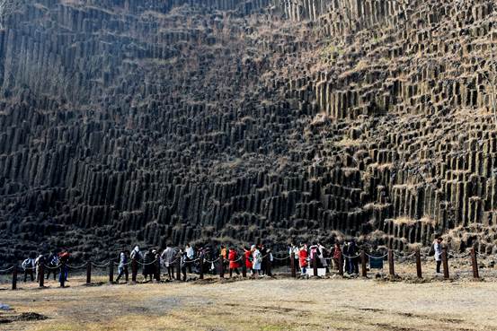 12月16日上午,抵达六合国家地质公园后,讲解老师带队参观由玄武岩构成的石柱林。通过老师的讲解,同学们了解了基性火成岩玄武岩与超基性岩地幔包体橄榄岩的产生原因,岩浆岩的地质分类和种类,学习了与内外动力地质作用有关的知识点,玄武岩“柱状节理”,“杏仁状气孔”的形成过程。除了聆听老师的讲解,同学们还仔细观察了玄武岩的颜色,气孔,节理面等物理特征,在玄武岩节理面上找寻淡绿色的橄榄岩包体,对玄武岩和地幔包体有了更直观的认知。参观完石柱林,同学们跟随带队老师登山远眺远处两座死火山的火山锥形貌,感受大自然强大的创造力。