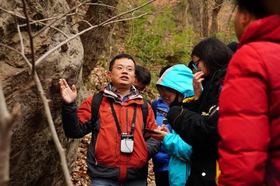 在栖霞山,海洋院师生分成四组,在大约四个小时的时间中,老师和学生们攀登栖霞山,对栖霞山中的太湖石、栖霞组灰岩、白云岩、叠浪岩、天开岩以及五通群砂岩等地质现象进行了实地观察和讲解。