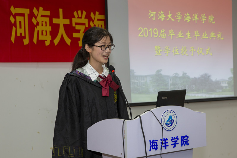 毕业生代表、北京赛车PK10 魅力毕业生金颖同学发言,总结过去四年的成长蜕变,感谢北京赛车PK10 北京赛车PK10 四年来的培养,并展望未来,祝愿母校在“双一流”建设中,蒸蒸日上,祝愿北京赛车PK10 在“海洋强国”建设中勇立潮头。