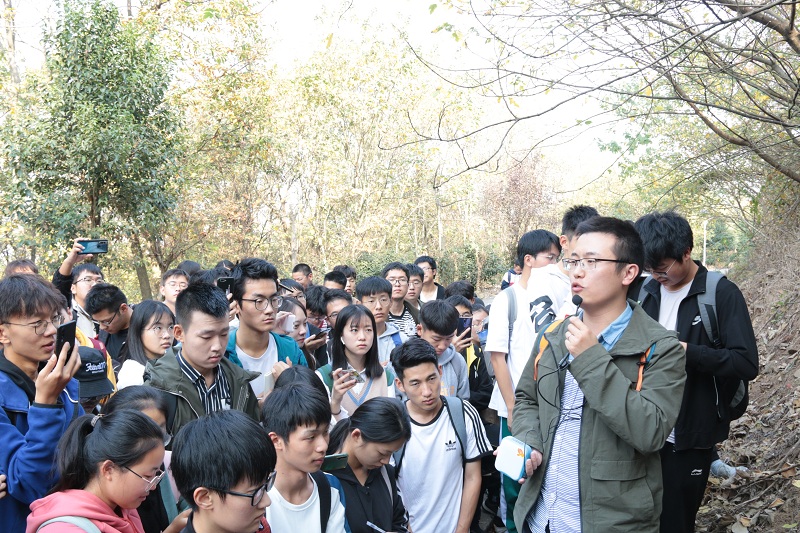 随后在桂子山的实地观察学习中,同学们被大片石柱林所震撼,指导教师讲解了柱状节理的成因以及如何识别玄武岩中的幔源包体。在南京石头城遗址公园中,指导教师详细讲解洪积砾岩的特别之处及其复杂的组分所反映出的地质信息。