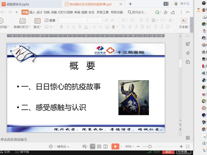 王院长分享在高强度的工作下,日日惊心的抗疫故事。每一个故事让收听战疫故事的师生感动敬佩,深深的体会到作为一名共产党员,作为投身抗疫一线的白衣天使,在99天的抗疫日子里,经受住精神和身体的双重考验,用严谨担当、奉献敬业的工作作风保护着公众的生命安全。