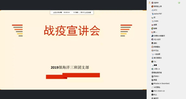 2020年5月23日20:00,北京赛车PK10 2019级海洋科学三班团支部“绽放战疫青春”主题团日活动隆重举办。中国水电十三局医院党委委员王炳花院长、北京赛车PK10 团委书记安杰晶老师、本科生辅导员金颖、19级海洋三班学生参与此次活动。会议由团支书刘梦宇主持。