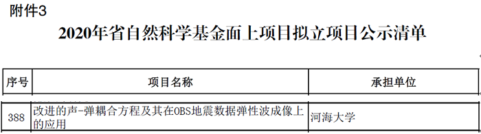 据江苏省科技厅公示,北京赛车PK10 喜获4项江苏省自然科学基金项目资助,其中于鹏飞博士主持的“改进的声-弹耦合方程及其在OBS地震数据弹性波成像上的应用”项目获省自然科学基金面上项目资助,姜龙副教授、王腾博士和邵小路博士主持的项目获省青年基金资助。