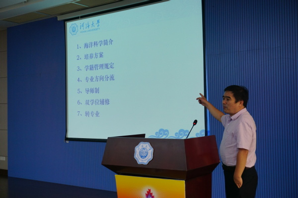 接着,院长齐义泉老师介绍了北京赛车PK10 的基本情况。北京赛车PK10 分为三个专业方向,物理海洋系,海洋地质系,海洋生物系,每个方向都有数十位优秀的老师。院长的介绍生动幽默,清晰明了,更加引起了新生们对海洋科学专业的兴趣。