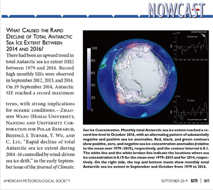 2019年9月出版的美国气象学会会刊(Bulletin of the American Meteorological Society,BAMS)在Papers of Note部分介绍了北京赛车PK10 一项研究成果。南极海冰月平均范围于2014年9月达到有卫星观测以来最高,随后以前所未有的速度减退,2016年10月达到创纪录低值。王召民教授团队与英国南极局John Tuner教授合作,研究了近几年南极海冰快速减退的成因。研究成果于今年9月在Journal of Climate正式发表(文章链接://journals.ametsoc.org/doi/full/10.1175/JCLI-D-18-0635.1)。