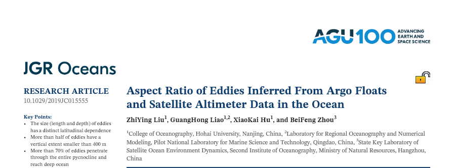 北京赛车PK10 物理海洋系2018级硕士研究生刘志颖等在导师廖光洪教授的指导下,采用高度计资料和Argo剖面浮标观测资料,研究分析了准全球海洋涡旋的纵横比以及涡旋的垂直尺度分布的地理特征。