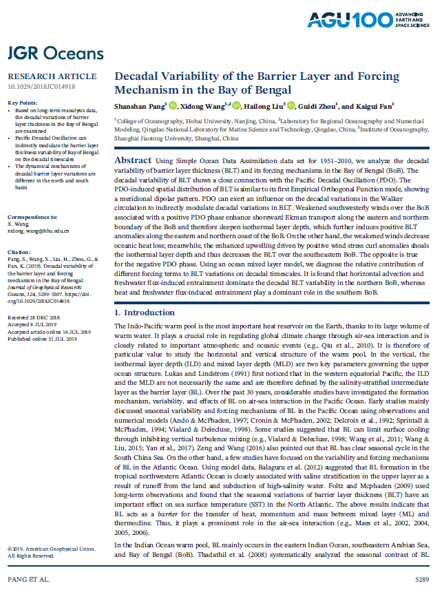 3、Shanshan Pang, Xidong Wang, Hailong Liu, Guidi Zhou, Kaigui Fan (2019). Decadal variability of the barrier layer and forcing mechanism in the Bay of Bengal. Journal of Geophysical Research: Oceans, 124(7), 5289–5307. //doi. org/10.1029/2018JC014918.