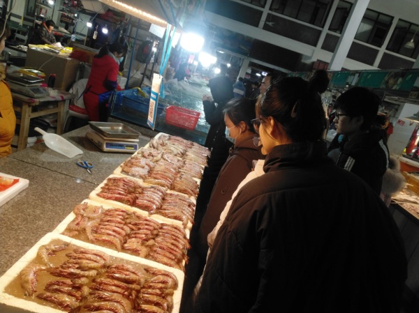 19日的第一站是吕四盈港海鲜市场,海洋的味道让同学们一下子兴奋起来。在三位老师的带领下,同学们和鱼虾贝藻等经济水产品零距离接触,那些只在书本上听过、看过的名字突然浮现在眼前,让同学们在激动之余收获良多。下一站是六大国家级中心渔港之一的吕四渔港,在这里同学们偶遇满载归港的渔船,体会到了渔民丰收的喜悦。随后,在江苏海洋水产研究所的吕四基地,同学们参观了养殖车间,并在张志伟主任的解说下,进一步学习了鱼类、贝类经济品种的繁育技术,大大增加了同学们对水产品养殖培育的兴趣。