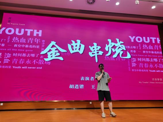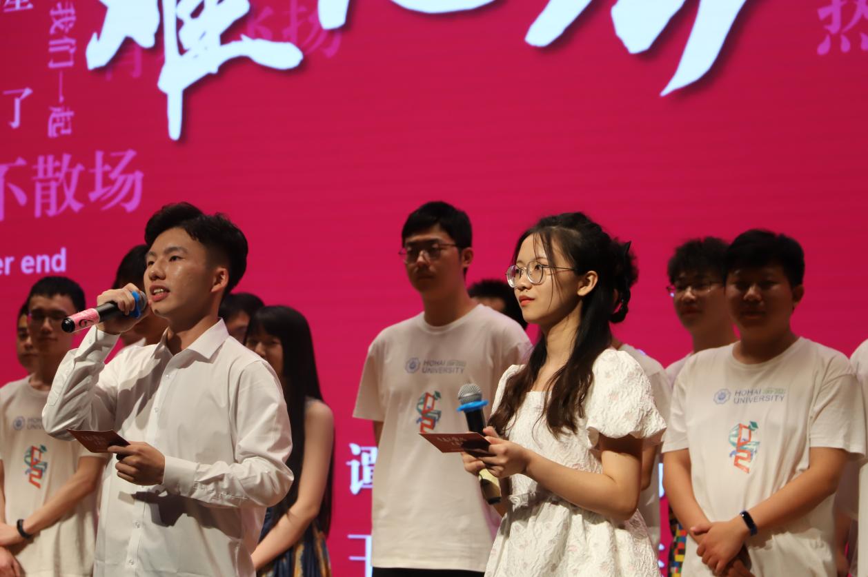 20研究生刘焕宇以一首《守护解放西》向全场观众展现了湘江的赤诚豪爽,热烈点燃舞台。18级本科生陈劭雯、付可欣、李业蓝、吴梦霞带来的动感舞蹈《你没事吧》嗨翻全场。20级博士生胡逍锴、21级博士生王冠以《孤勇者》、听不到》及《凤凰花开的路口》三首金曲串烧,为即将离别的学弟学妹送上深切祝福。小品《甄学家在河海》将海洋学子精湛的模仿表演能力展现地淋漓尽致,甄嬛体金句频出,引得观众捧腹大笑。经过魔性改编的《两只老虎》舞蹈,为大家带来了全新的演绎形式,将童年的欢快与热烈的青春融为一体。器乐交汇,金声玉振,余音绕梁,器乐队一曲悠扬婉转的《样》为观众带来听觉上的盛宴。