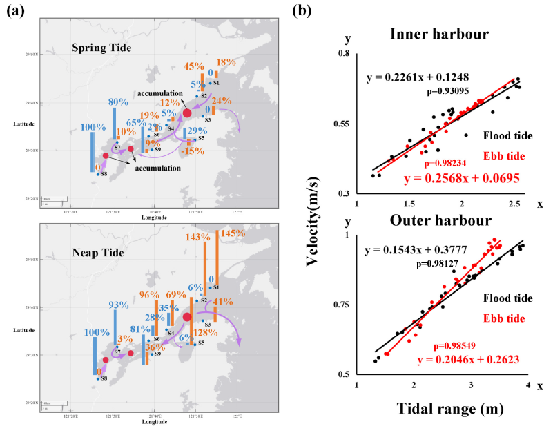 图. (a)象山港微塑料在大小潮期间的迁移(蓝色柱状图表示进入海湾西侧内港区的微塑料百分比,黄色表示离开象山港);(b)中央水道的存在影响了潮落潮流速。