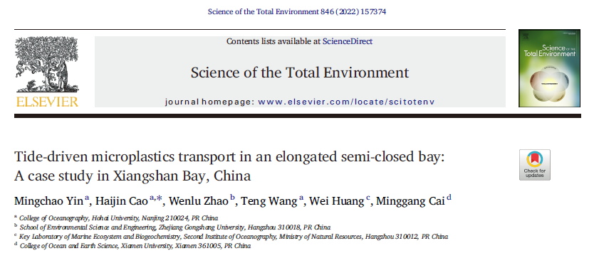 Mingchao Yin, Haijin Cao*, Wenlu Zhao, Teng Wang, Wei Huang, Minggang Cai (2022). Tide-driven microplastics transport in an elongated semi-closed bay: A case study in Xiangshan Bay, China. Science of the Total Environment 846, 157374. //dx.doi.org/10.1016/j.scitotenv.2022.157374