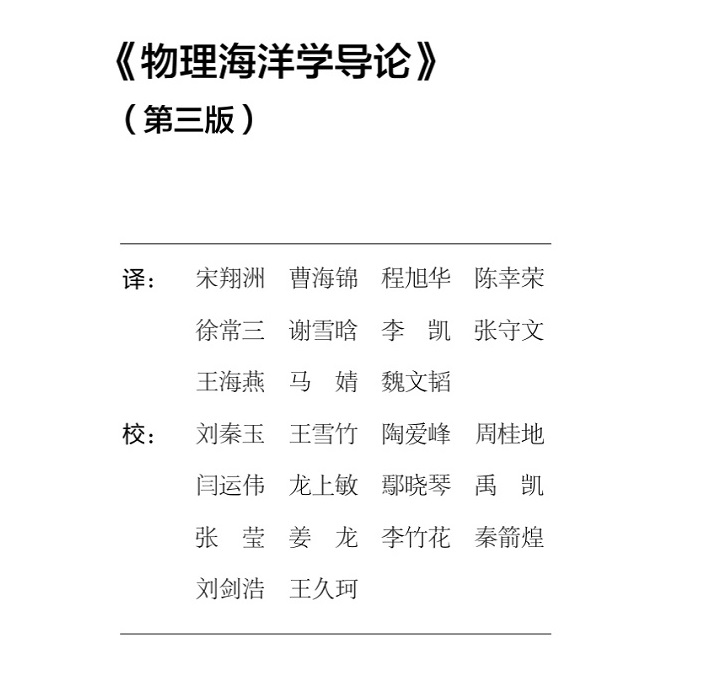 翻译团队主要由北京赛车PK10 青年教师和预报中心气候预测团队组成,并得到中国海洋大学刘秦玉教授的指导和校稿,北京赛车PK10 多名青年教师和研究生参与其中(见图2)。经过多轮翻译和润色、校对、审核工作,历时近一年完成了原著翻译工作。团队成员本着一丝不苟的原则,对译文质量严格把关、反复推敲,力求信、达、雅,保证科学严谨性和语言优美性的结合,力争为我国物理海洋学的教学和科研贡献一部高水平教材译著。