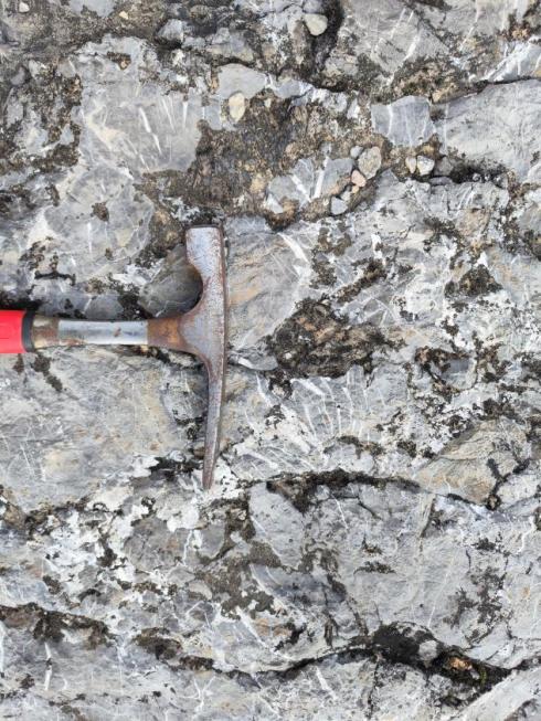 11月12日上午,怀着期待的心情,同学们来到了实习第一站—“天下第一碑”南京阳山碑材遗址,实习之旅由这里的下二叠统栖霞组灰岩展开。沿着崎岖的山路,伴随着老师们娓娓的讲解,同学们一边前进,一边增加了对实习区域地质背景的认识。到达黄龙山北侧后,同学们三五成群,仔细观察了下二叠统栖霞组灰岩的特征,纷纷使用地质锤,敲下了一块属于自己的岩石手标本。此外,同学们也学习了手持式GPS的使用,对断层的类型进行了判断,并且运用所学通过罗盘测量了该断层两侧岩层的产状。记录整理好野外记录本后,同学们抵达山顶,一起欣赏了巍峨的阳山碑材碑身和碑额,圆满完成了第一天的实习任务。