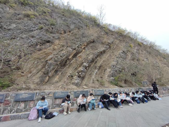 12月8日,同学们满怀期待,踏上了第二阶段实习之路。来到江苏省园博园棒锤山西侧,通过张鹏辉老师和张超的讲解介绍,同学们学习和观察了上二叠统大隆组和三叠系中下统青龙组地层,体验了以短短百米的距离跨越上千万年的地质历史。在交错的地层互层露头,同学们手拿地质锤,切身体验着不同岩石岩性的差异;在张鹏辉老师的讲述中,同学们从眼前的地层出发,在脑海中勾勒出一幅磅礴的构造演化画卷,想象着南京地区二叠纪以来的海陆变迁。