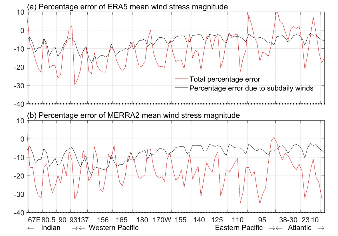 图2、再分析数据中平均风应力的误差百分比(红线)及由风场日内变化引起的误差百分比(黑线):ERA5(上图)、MERRA2(下图)。