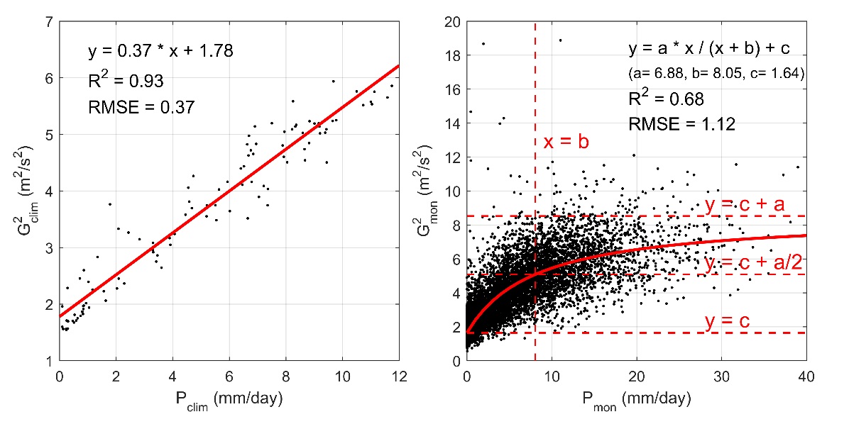 Fig. 3. Regression model between the square of the gustiness value (G^2) and precipitation rate (P) for the time-independent (left panel) and time-dependent (right panel) schemes.