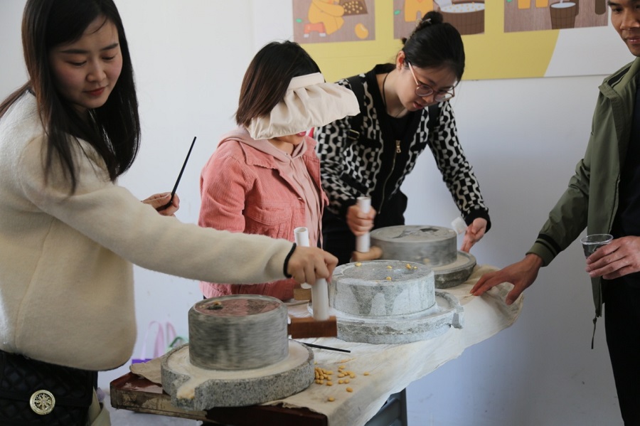 随后老师们兴致勃勃地来到幸孚村豆腐坊,跟随师傅体验了手工磨豆浆做豆腐的过程。品尝着亲手制作的豆浆和豆腐,每个人表现出无比的满足。从豆腐坊到田间,老师们拿起小铲子挖起了荠菜。荠菜好吃得来不易,平日里站在讲台上洋洋洒洒写板书,兢兢业业教书育人的老师们,认真挖着小小的荠菜,让人不禁想到了“最可爱的人”。