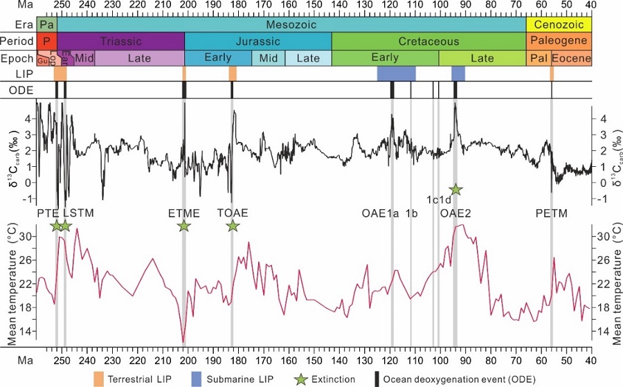 图 1 中生代-古近纪极热事件期间全球碳循环扰动与大火成岩省喷发和大洋脱氧事件的对应关系