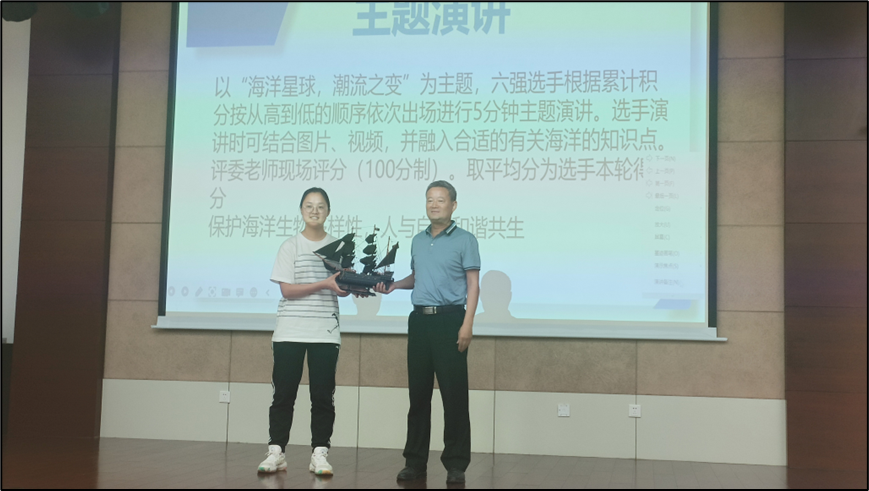 进入最后的主题演讲环节,本次演讲的主题是今年世界海洋日的主题“海洋星球,潮流之变”。选手们结合主题,从不同角度出发,有的从海洋污染讨论保护海洋环境,有的谈论应合理利用海洋资源,推动海洋可持续化发展,有的串联古今,讲述了自己家乡地貌的变化。在演讲环节,评委们对选手们的演讲进行了逐一的点评分别指出了选手们演讲中的出彩点和不足之处,并教导选手们让演讲更加出彩的方法,比如PPT的制作应该把控好文字和图片的数量,演讲应尽量做到脱稿,视线看向观众等。相信评委老师们的教导让选手们受益匪浅。