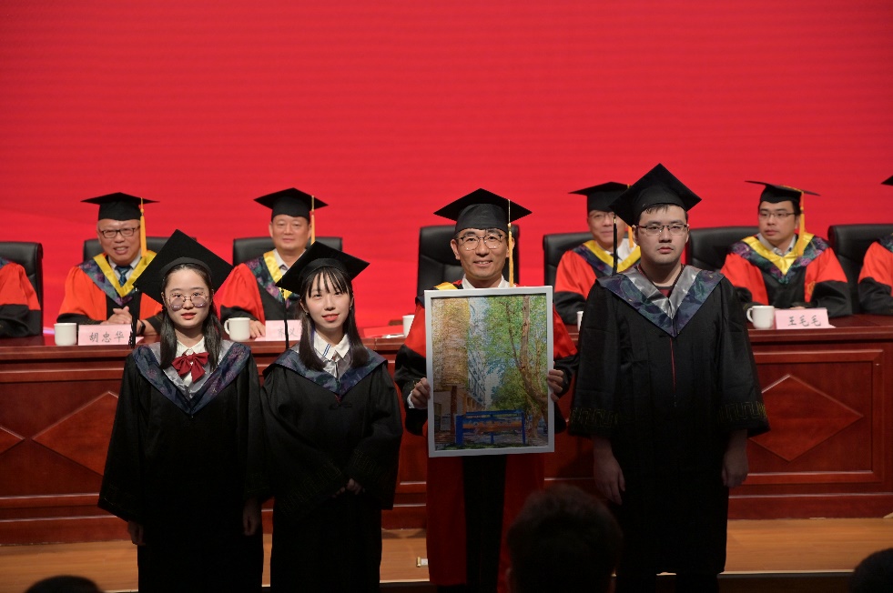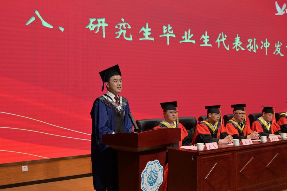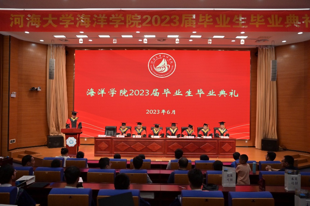 典礼嘉宾、83级海洋工程水文专业杰出校友邓东升董事长向毕业生们表示最诚挚的祝贺,向母校和老师们致以最崇高的敬意。他以“海”为题与毕业生们分享了自己的几点感悟。一是要以“海的风度”塑形象,彰显新时代河海海洋人的特质,希望毕业生永葆追逐理想的热情、永葆吃苦耐劳的毅力、永葆无私奉献的品格。二是要以“海的气度”宽胸襟,彰显新时代河海海洋人的格局,做到善于倾听能容言、求同存异能容事、换位思考能容人。三是要以“海的深度”练内功,彰显新时代河海海洋人的底蕴,做到勤于学习多充电、肯于钻研多增能、勇于创新多探索。四是要以“海的力度”干事业,彰显新时代河海海洋人的担当。做到学会用狠劲干事业、学会用拼劲干事业、学会用韧劲干事业。勉励毕业生们传承河海精神,怀揣海洋梦想,在新的人生征途上,追逐属于自己的诗和远方。