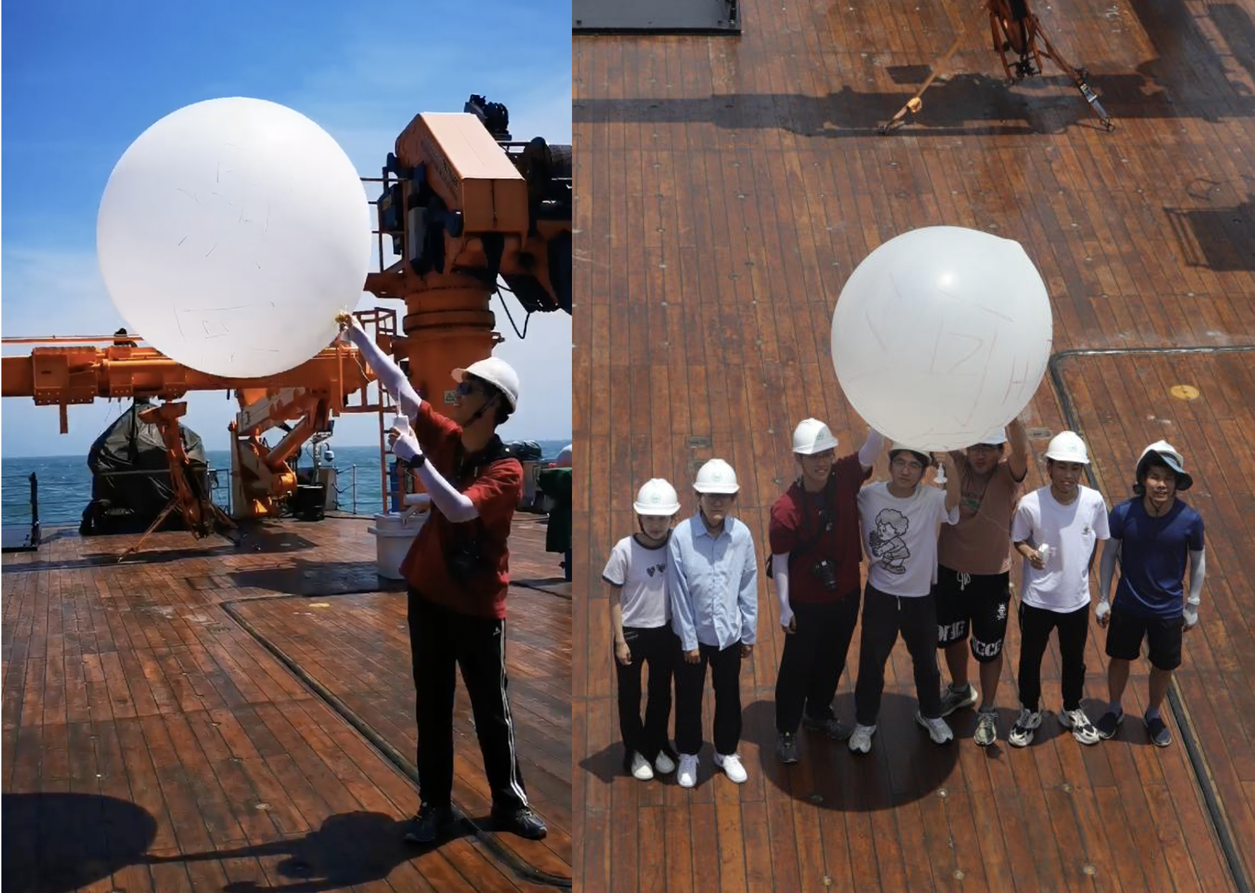 7月7号上午,“中山大学”号航行至台州沿岸海域站位,当天天气海况较差,遭遇了7级阵风,8级大浪,但北京赛车PK10 六名学生经受住了大风大浪的考验,克服了晕船的不适,顺利完成了海洋气象观测实习内容。韩博副教授介绍探空仪器使用方式后,北京赛车PK10 师生成功放飞探空气球,并在实验室实时读取传感器得到海上不同高度温度、气压、风速、空气湿度等海洋气象数据。随后在周海涛工程师的介绍下,了解学习了微波辐射计、激光风廓线雷达等气象观测仪器的使用及数据读取方式。在完成当天科考作业后,全体船员及参航师生进行了安全演习,熟悉了各项救生装置的使用及位置。
