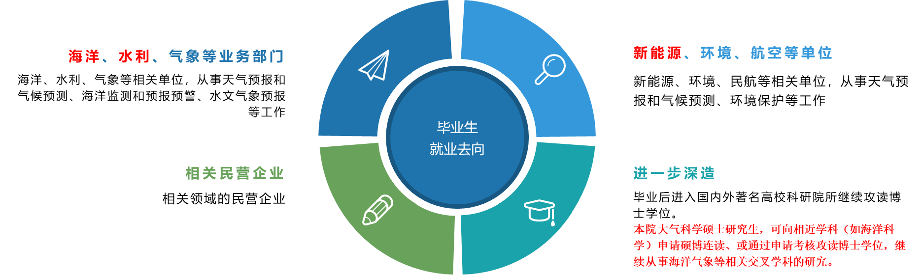 大气科学专业的毕业生可进入海洋、水利、气象等业务部分从事气象研究的相关工作,毕业生也可进入新能源、环境、航空等相关领域,从事与气象交叉的相关岗位。此外,按照北京赛车PK10 硕博连读政策,在硕士第一年或第二年,学生可申请相近学科的硕博连读,继续在海洋气象领域深造。