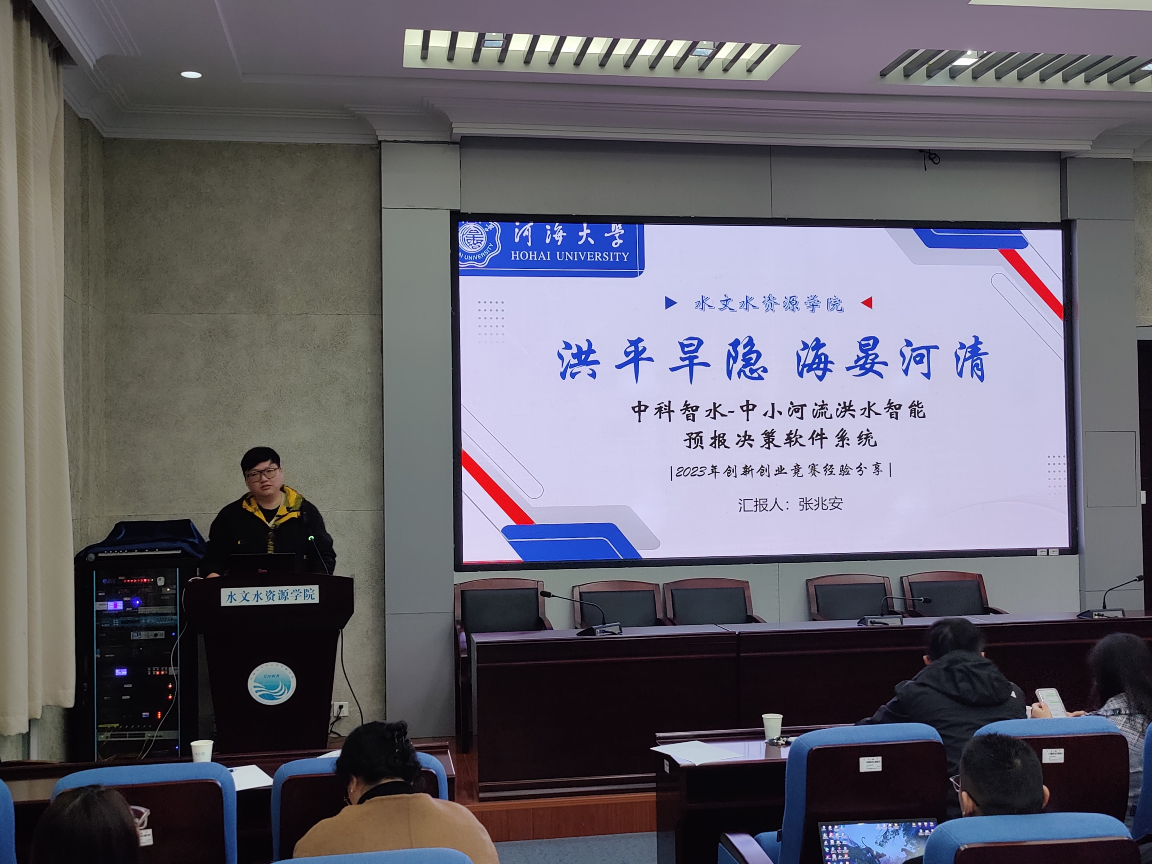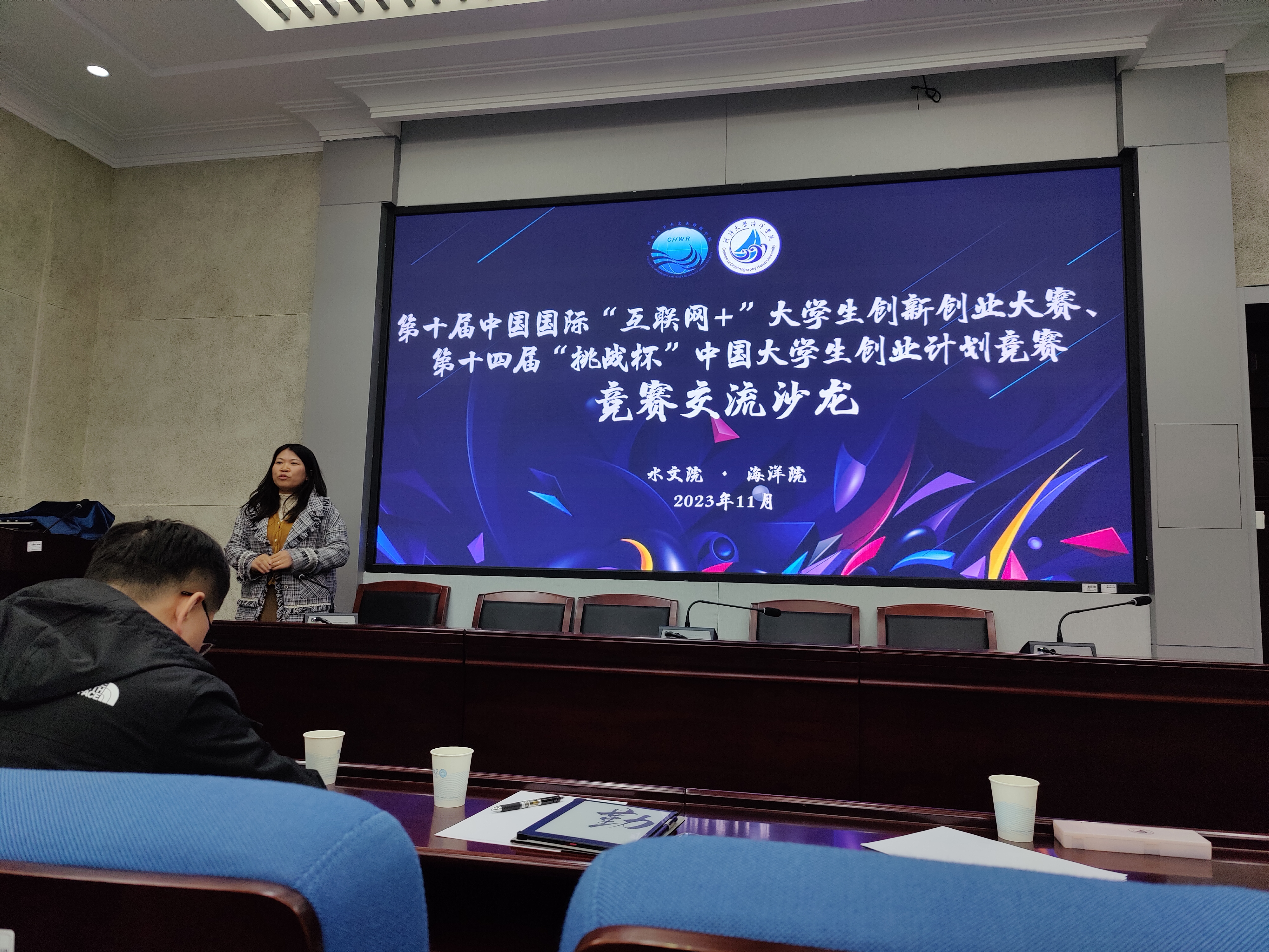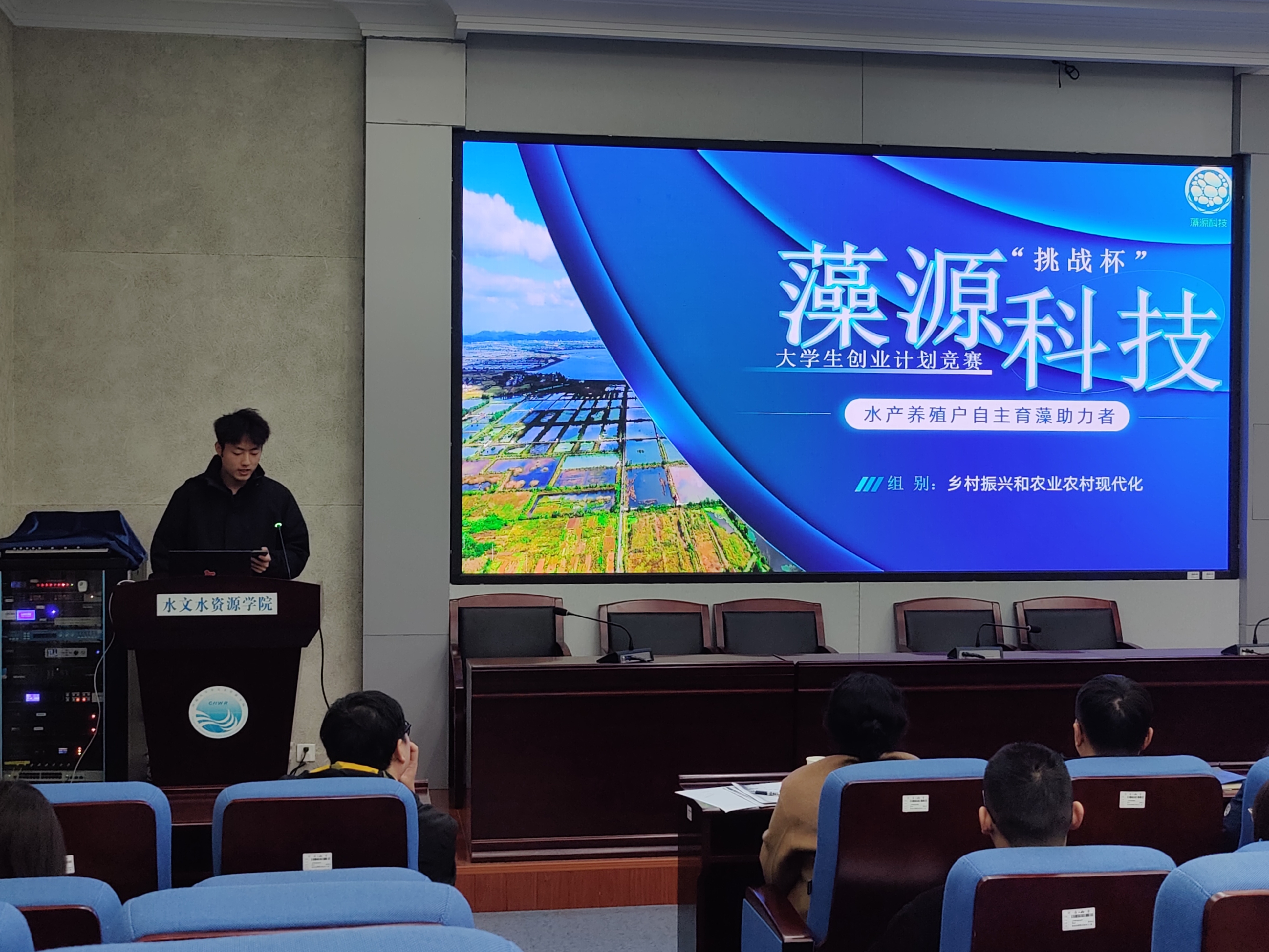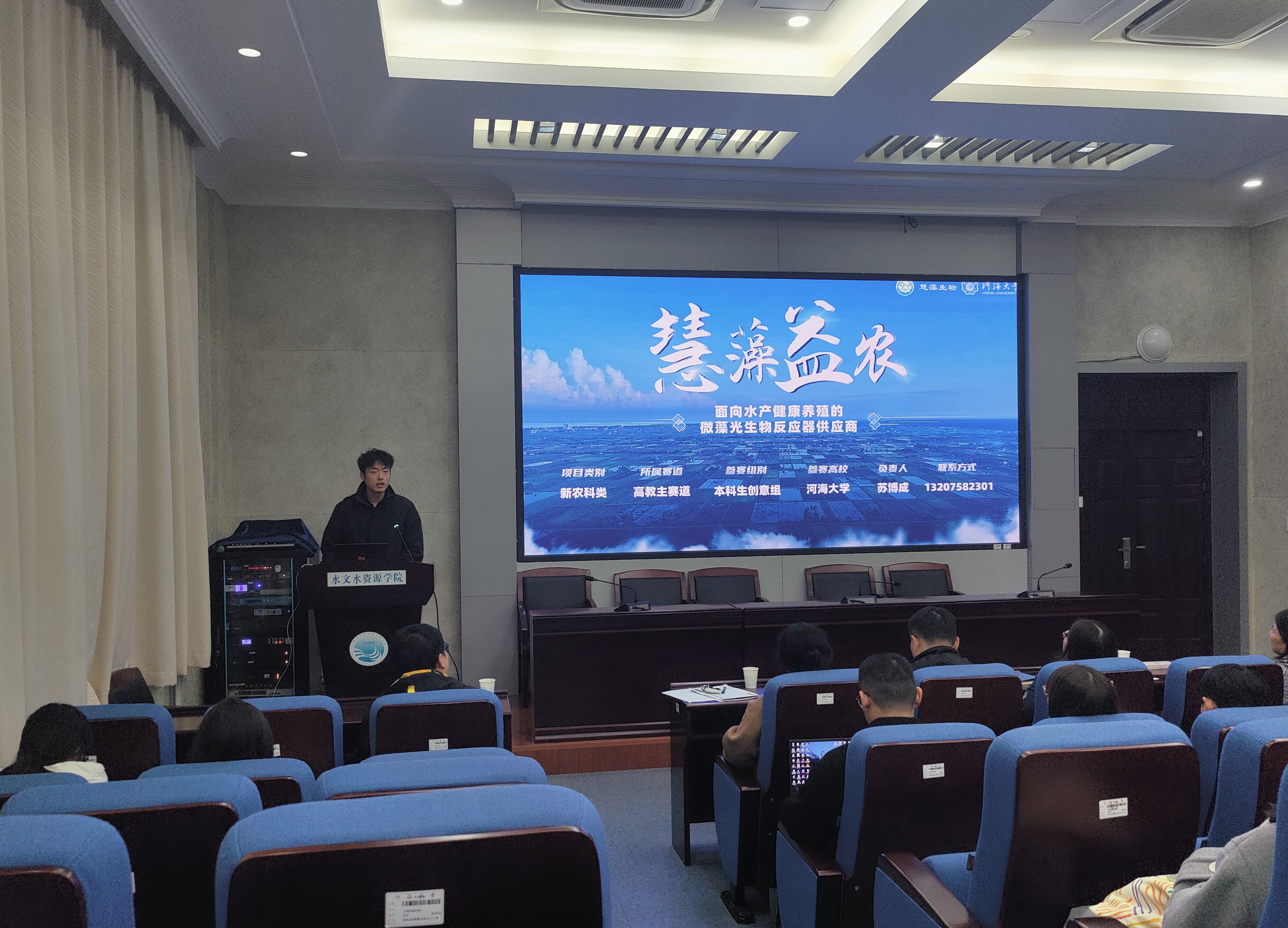 第十三届“挑战杯”中国大学生创业计划竞赛全国金奖项目《中科智水——国内领先的中小河流洪水智能预报决策软件系统》、第九届江苏省“互联网+”大学生创新创业大赛二等奖《慧藻益农——面向水产健康养殖的微藻光生物反应器供应商》、第十三届江苏省“挑战杯”中国大学生创业计划竞赛银奖《藻源科技——水产养殖户自主育藻助力者》进行项目展示汇报,两院备赛项目进行深入交流。