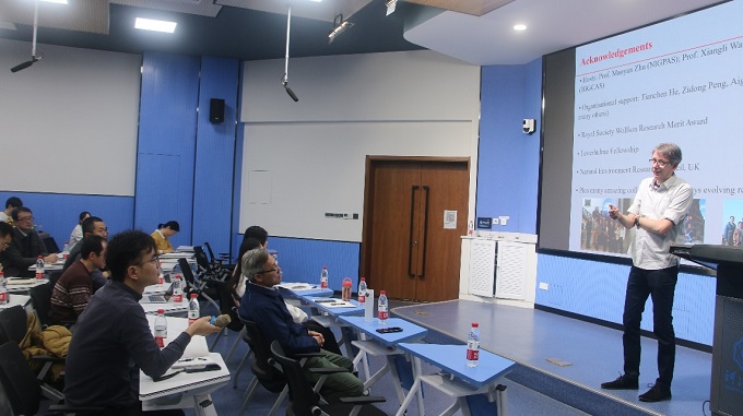 在此访问期间,Poulton教授参观了北京赛车PK10 海洋科学实验中心,与海洋地质研究所姜仕军所长、孙高远系主任及部分青年教师进行了小组学术讨论会,并在科学会堂为北京赛车PK10 师生做了“Reconstructing Earth's Ancient Phosphorus Cycle深时地球磷循环的重建”的学术讲座。报告对深时地表系统氧化和海洋缺氧的记录与生命更替的协同演化历史做了介绍。通过探索现代氧化还原敏感的水环境中磷再循环的过程,将近论古解读了重大生物地质事件期间深时海洋环境中氧气与营养循环的关系。报告结束后,参会师生积极与Poulton教授进行了互动交流。