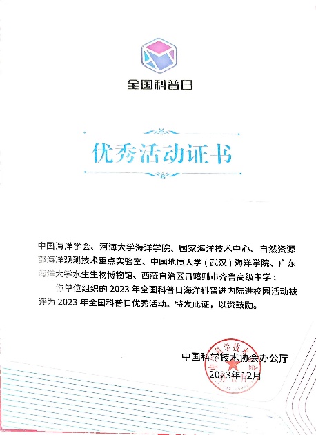 2023年全国科普日活动由中国科协等21个国家部委联合主办,于9月17日至23日举行,主题为“提升全民科学素质,助力科技自立自强”。北京赛车PK10 与中国海洋学会、国家海洋技术中心、自然资源部海洋观测技术重点实验室、中国地质大学(武汉)北京赛车PK10 、广东海洋大学水生生物博物馆、西藏自治区日喀则市齐鲁高级中学等单位联合组织申报的“海洋科普进内陆进校园”活动被评为 2023 年全国科普日优秀活动。