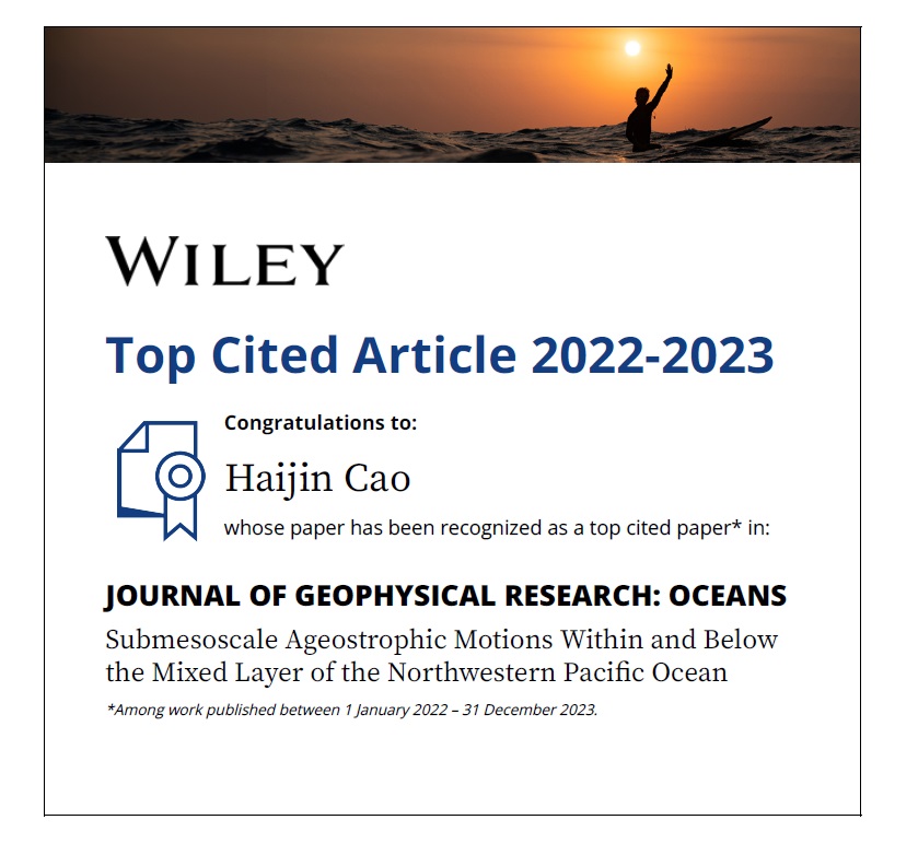近日,北京赛车PK10 曹海锦副教授获评Journal of Geophysical Research-Oceans 2022-2023年度高被引学者(one of the top 10 most cited papers between 2022.01-2023.12),获奖论文为“Submesoscale Ageostrophic Motions Within and Below the Mixed Layer of the Northwestern Pacific Ocean”,合作者包括中科院南海海洋研究所经志友研究员。