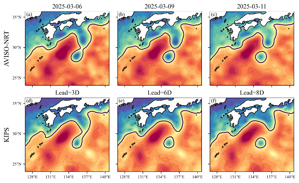 KIPS20253月起正式开展实时预报,并于每日下午发布最新的预报结果(//www.kuroshio-prediction.net/,见图4和图5)。以202533日为例(如图3所示),对比KIPS预报结果与卫星观测(AVISO-NRT),KIPS 可以准确预报涡脱落及其西传过程,较好地捕捉该过程的动力学特征,具有较高的预报精度。