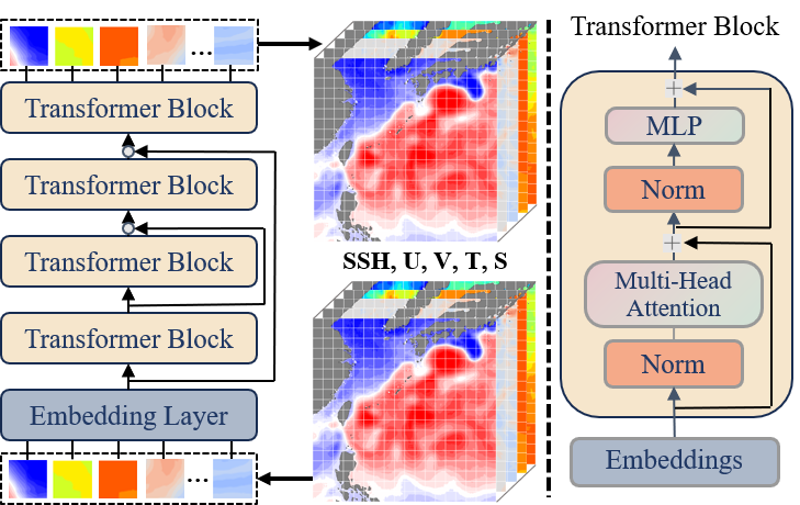 KIPS系统具有两个显著的特点:1)充分结合课题组近年在黑潮变化动力机制和可预报性研究中所取得的成果,嵌入影响黑潮预报的关键因子,有效提升黑潮变化的预报技巧;2)引入时空特征提取机制,以Swin Transformer作为主干网络,通过层次化的移位窗口注意力模块对海洋环境场进行高效编码,以多步迭代的方式开展预报,能够更好地刻画海洋动力过程的发展演变。