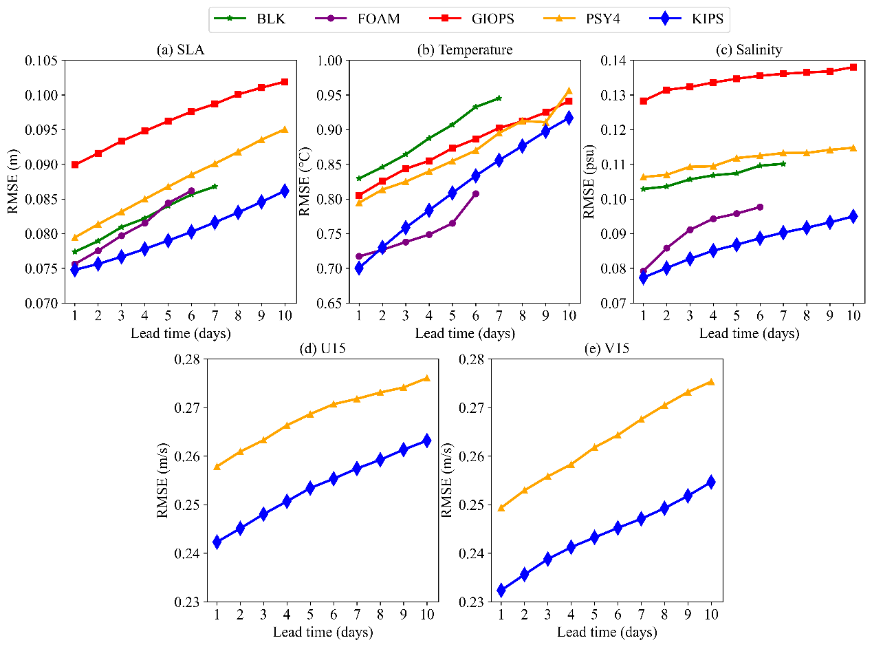 利用 IV-TT Class4框架对KIPS进行评估,KIPS提前10天海面高度、温度、盐度和流场预报均方根误差(RMSE)分别为7.9cm0.81°C0.087psu0.25m/s,优于BLKGIOPSFOAMPSY4等国际先进的数值预报系统(如图2所示)。