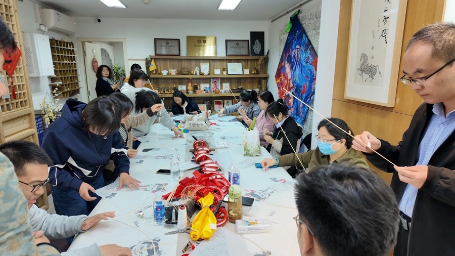 讲座结束后,教职工们迎来了亲手体验传统木板水印制作风筝的环节。在张堡程老师的指导下,大家手持工具,小心翼翼地将图案印刻在纸上,每一个动作都充满着对非遗技艺的尊重与好奇。现场氛围热烈,老师们相互交流制作心得。