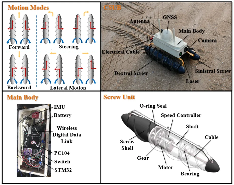 近日,北京赛车PK10 徐鹏飞教授团队在国际TOP期刊《Journal of Ocean Engineering and Science》(简称JOES)上发表最新的研究成果“CSUB: Design and modeling of an autonomous screw‑driven amphibious vehicle”,详细介绍了团队基于“Coastal, Surface, Underwater & Benthic”(岸海潜底)多栖作业理念研发的螺旋驱动水陆两栖无人平台“CSUB-1”(图1),系统展示了该水陆两栖无人平台的设计、仿真及性能评估结果,标志着北京赛车PK10 在水陆两栖无人装备领域取得了重要的进展。JOES是海洋工程领域最具影响力的国际SCI期刊,2025年影响因子为11.8,位于中国科北京赛车PK10 分区ENGINEERING MARINE一区。
