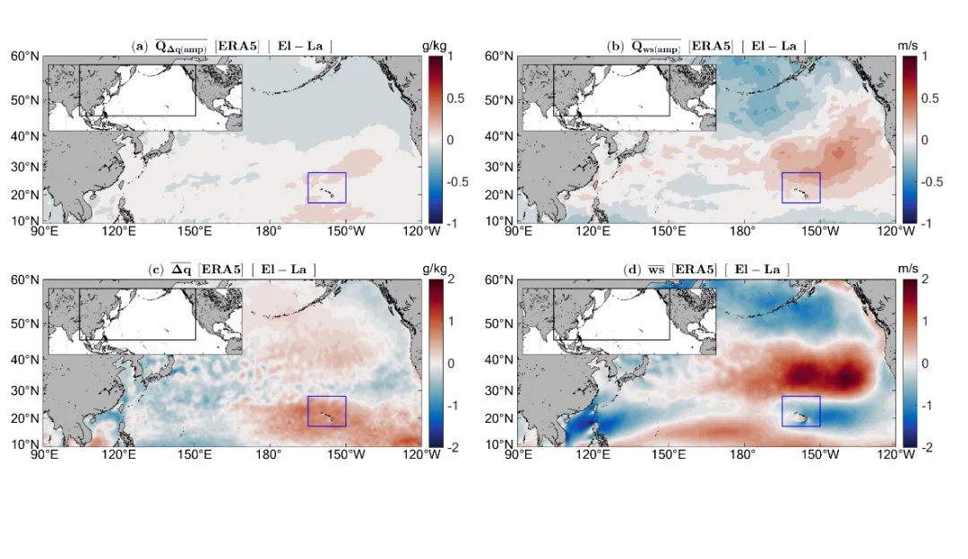 图2、厄尔尼诺与拉尼娜冬季期间海气变量的差异:(a-b)海气湿度差和风速的日内变化振幅、(c-d)海气湿度差和风速的平均值(数据来自ERA5,选取1979–2022年间11次厄尔尼诺事件与8次拉尼娜事件)。