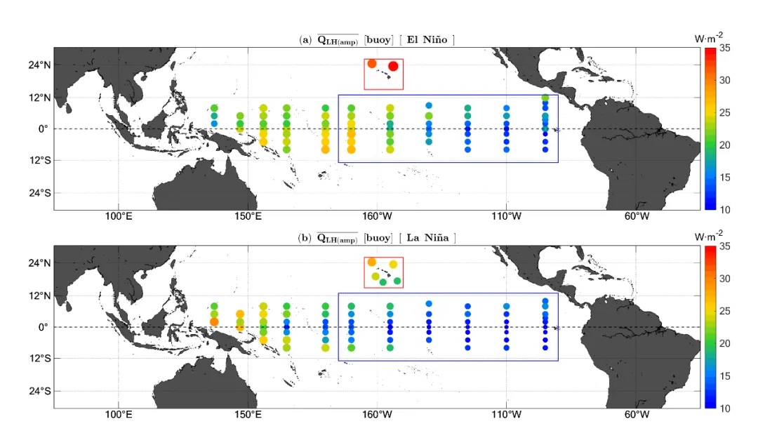图1、(a)厄尔尼诺与(b)拉尼娜冬季期间潜热通量的日内变化振幅(数据来自夏威夷群岛周边6个NDBC浮标及TAO/TRITON阵列;红色矩形框:夏威夷群岛区域15°N–26°N, 150°W–165°W;蓝色矩形框:冷舌区;其余部分:暖池区)。